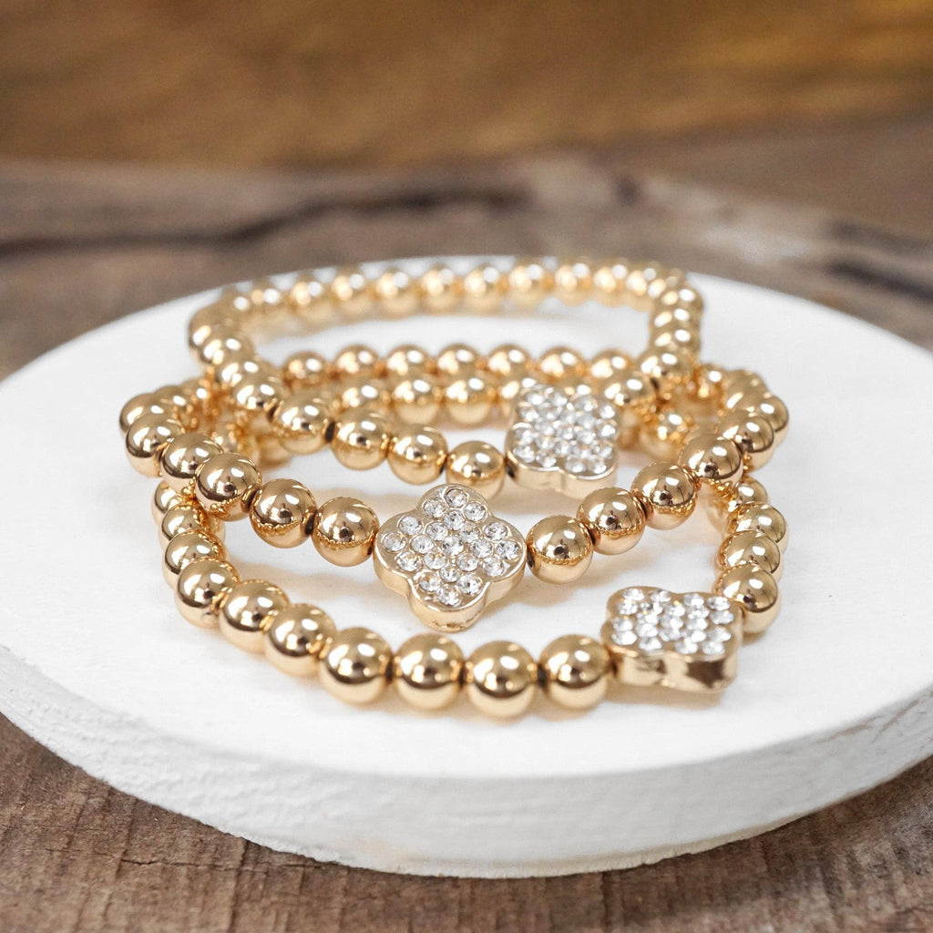 Crystal Quatrefoil Gold tone ball beads bracelet stack of 3 bracelets